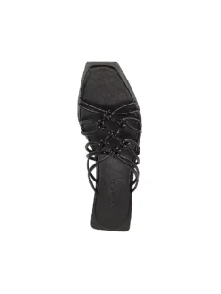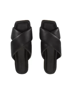 Slide-Sandalen aus weichem Nappaleder. Mit gepolsterten Criss-Cross-Riemen. Schwarze Gummisohle. Innensohle aus Leder mit einem leichten anatomischen Fußbett und Branding. Ein cooler Style, komplett in Schwarz und mit klobigen Details.